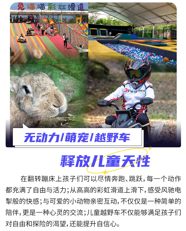2、翻转大蹦床畅玩、萌宠乐园动物互动、彩虹大滑道1次