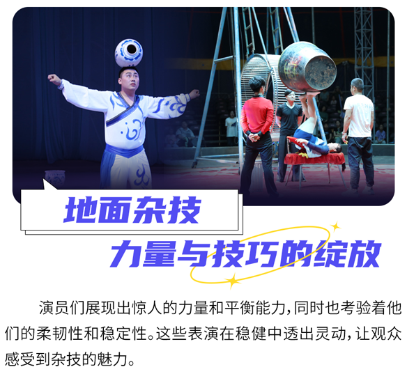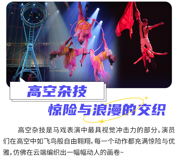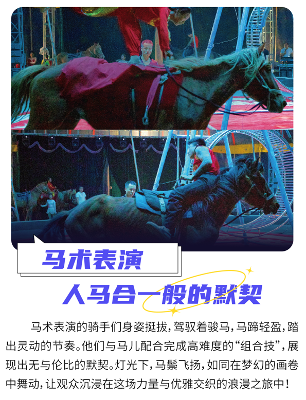 演出涵盖高空杂技、地面杂技、马术表演、小丑滑稽表演.极限飞车等多种精彩绝伦的节目,通过零距离表演让观众们沉浸其中。