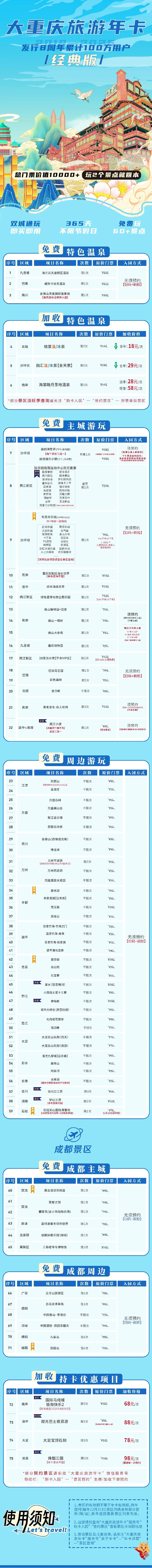 大重庆旅游年卡(经典版),是重庆众多景区联合发行的一款惠民旅游年卡,365天畅游,不受节假日限制,大重庆60+景区,价值10000元以上,