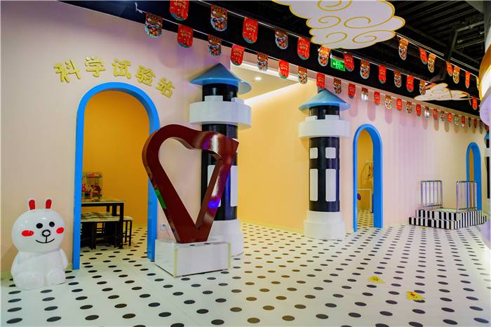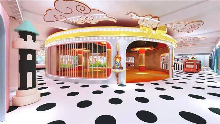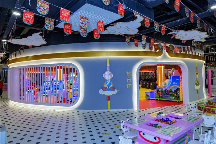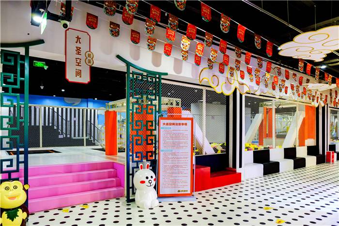 乐园随处可见的唐僧师徒四人与屋顶祥云装饰,天蓬乐园(儿童软体区)、大圣空间(超级酷跑蹦床)、花果山练兵场(儿童体适能)、DIY益智手工区、职业体验馆5大主题游乐集游乐、运动、益智、健身为一体,将儿童置身于一个惊险刺激、又安全放心的游乐环境。
