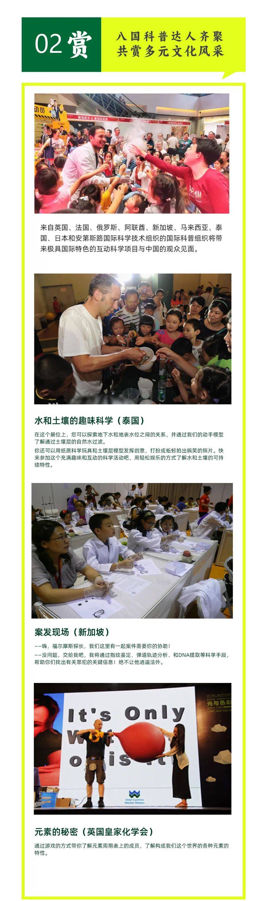 门票内容:来自英国、法国、阿联酋、新加坡、泰国、日本等九个国家的国际科普组织将带来极具国际特色的互动科学项目与中国的观众见面。