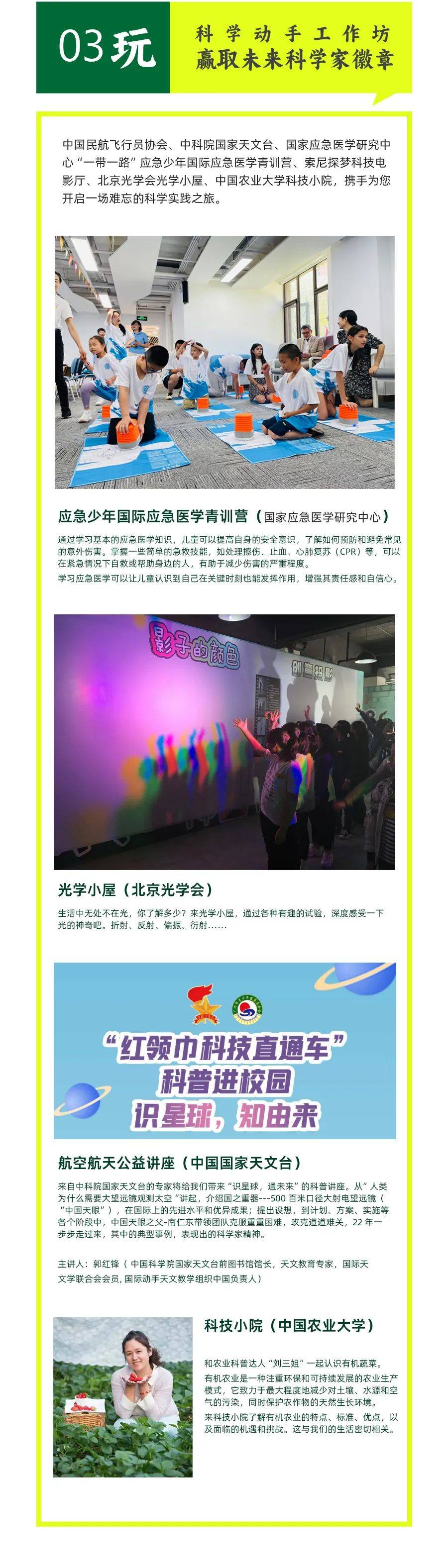科学节将汇聚众多大型科学实验秀、动手工作坊、实景科学游戏、科普创意市集,为你带来丰富的互动体验。你将跟随中国民航飞行员协会、中科院国家天文台、国家应急医学研究中心“一带一路”应急少年国际应急医学青训营、索尼探梦科技馆、科学院光学小屋、中国农业大学科技小院等开启一次难忘的科学实践之旅。