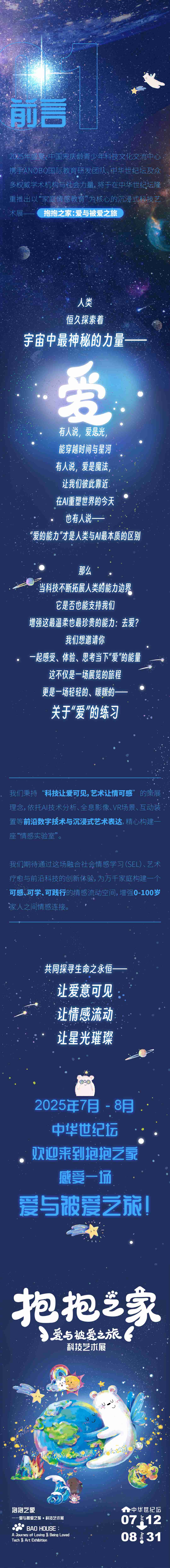 “抱抱之家—爱与被爱之旅”科技艺术展是一场融合情感体验与前沿科技的多感官艺术盛宴,旨在通过沉浸式互动装置、数字艺术及AI技术,探索人类情感联结的深层意义。