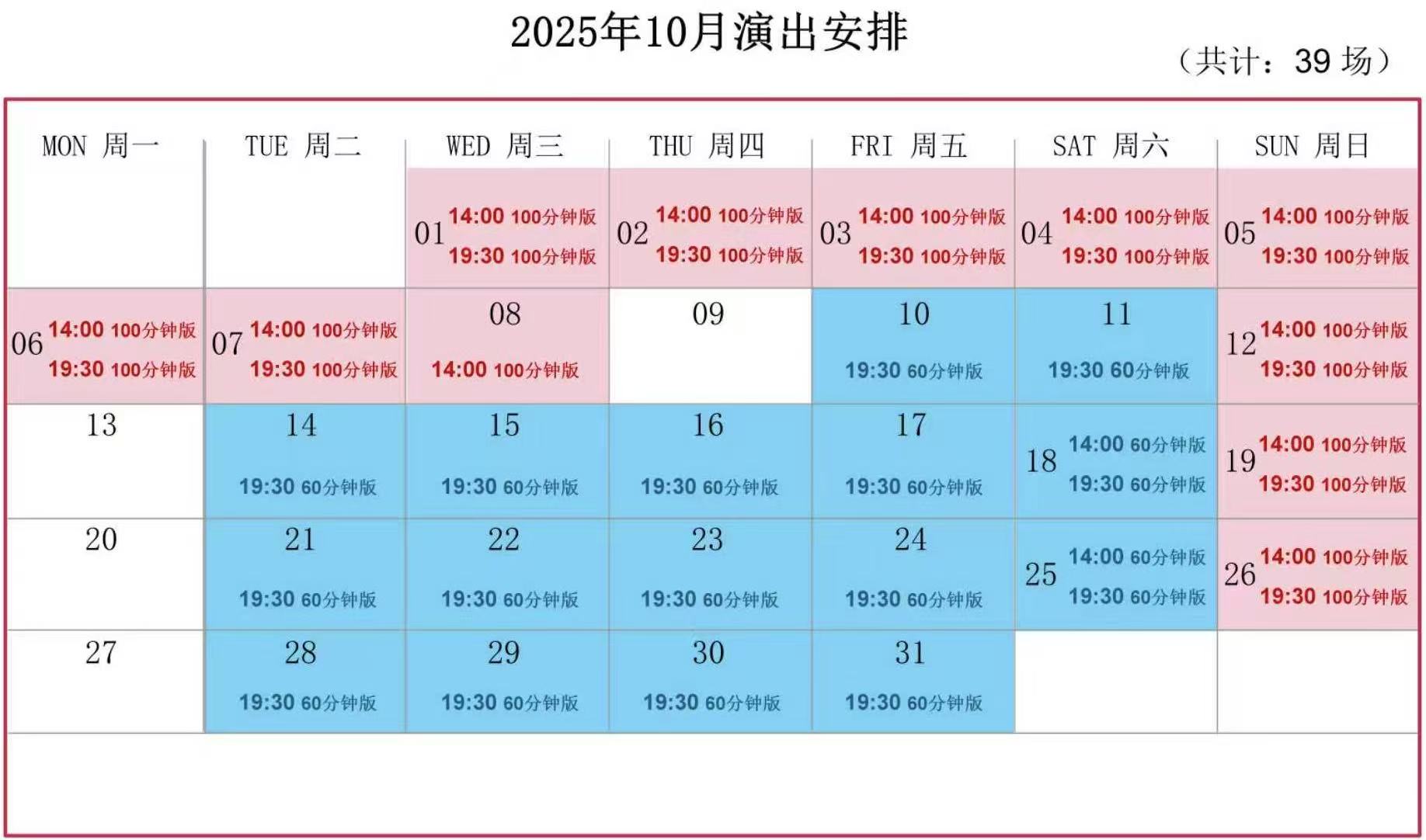 2025年国庆恰逢中秋,八天超长假期(10月1日-8日)将迎来文旅消费高峰,上海马戏城《ERA时空之旅2》10月演出档期公布,共计演出39场,其中:10月1日—10月8日、12日、19日、26日,演出为100分钟版本,其他日期为60分钟版本。
