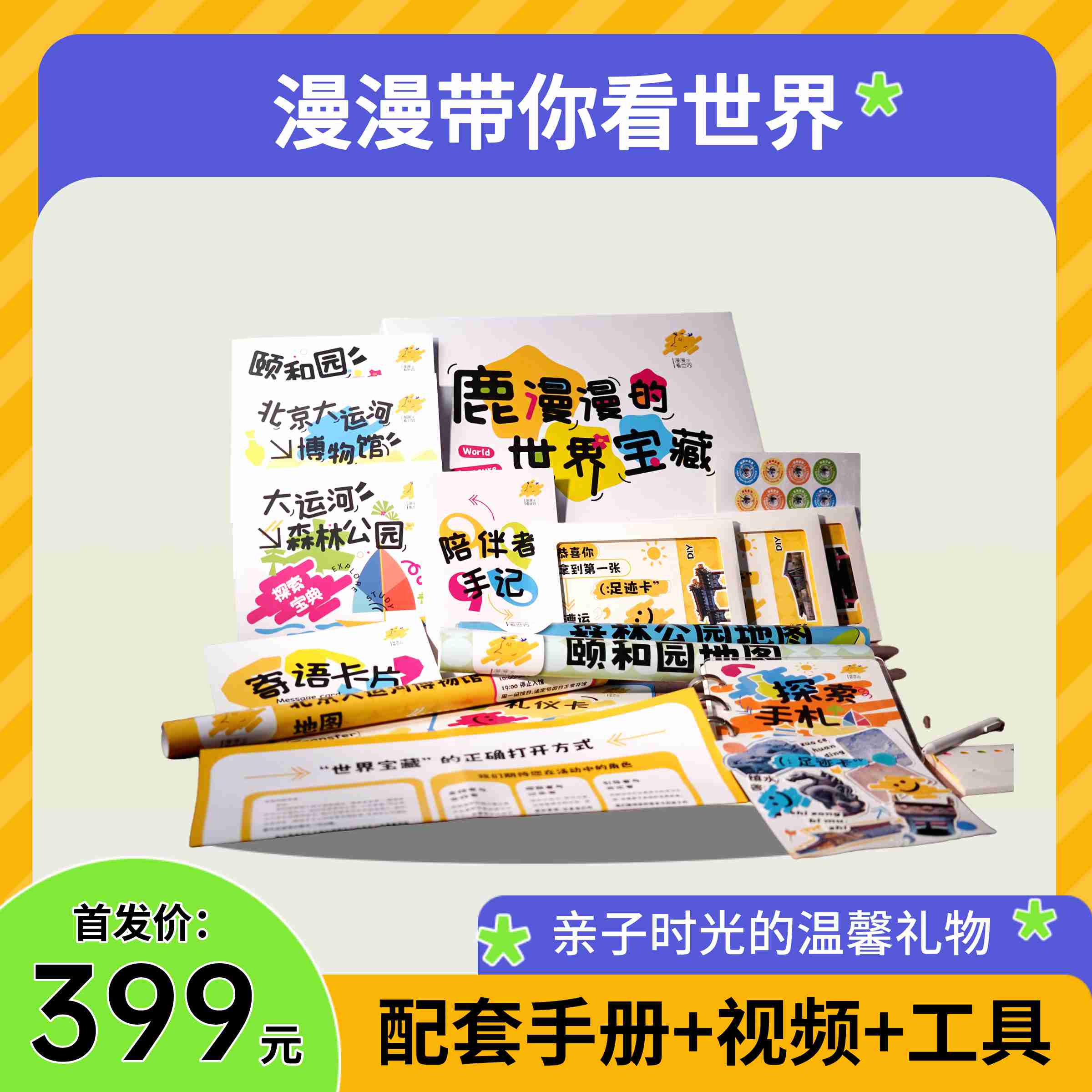 包含:1套漫漫带你看世界主题文化探索盒子,线上配套视频课程共128节,12小时公益时长及大运河游船实体票