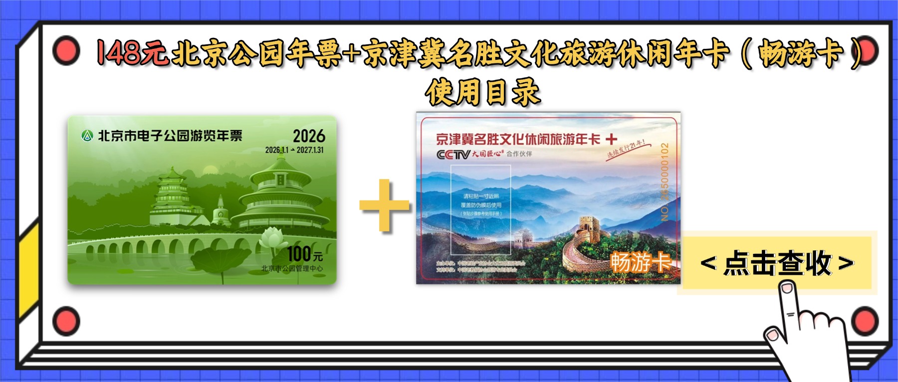 2025京津冀名胜文化休闲旅游臻选卡:慕田峪长城 、雁栖湖 、居庸关长城 、圆明园 、九华山庄温泉、首钢一高炉、杜莎夫人蜡像馆 、大美儿童乐园、穿越北京、熊猫亲子乐园、门头沟双龙峡 3A、门头沟双龙峡 、八达岭野生动物园、富国海底世界、盘山、石景山游乐园、中央电视塔、龙脉温泉竹林汤泉、野鸭湖、八奇洞、谷山村、长陵 、神路、昭陵、银山塔林、北京国际鲜花港、古崖居、仙居谷、孤山寨、金海湖风景区 、百里山水画廊-乌龙峡景区、未来亲子网绳乐园、大美儿童乐园摩天轮、月河湾马术俱乐部、八奇洞 、盘山 景区等(具体使用规则以目录为准)