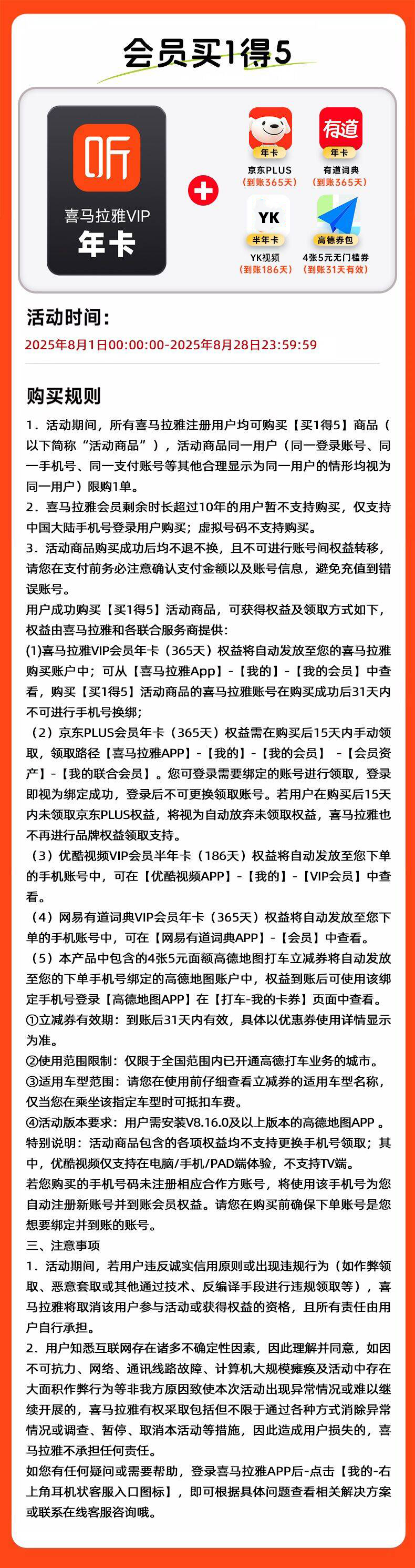 【限时直充】买1得5!168元享喜马拉雅VIP年卡 京东PLUS年卡【需手动领取】 YK半年卡 有道词典年卡 高德打车券],下单所有会员需绑定同一个手机号!