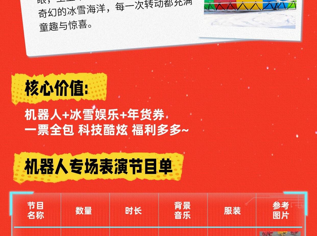 产品包含:冰雪世界多项畅玩套票(2份)、极速雪圈滑道(2份)、双轨冰峰速滑(2份)、雪地转转乐(2份)、尖叫雪地海盗船(2份)、雪地章鱼欢乐转(2份)、雪地游戏(2份)、机器人总动员专场演出(2份)、机器狗闹新春舞狮(特邀!)(2份)、机器人炫彩舞蹈串烧(全国巡演)(2份)、机器人京剧表演(特邀!)(2份)、机器人查尔斯顿舞(2份)、机器人英歌舞和广播体操舞(2份)、机器人斧头帮舞(2份)、机器人功夫(武术冠军赛获奖!)(2份)、机器人吉他演奏(全新首发原创!)(2份)