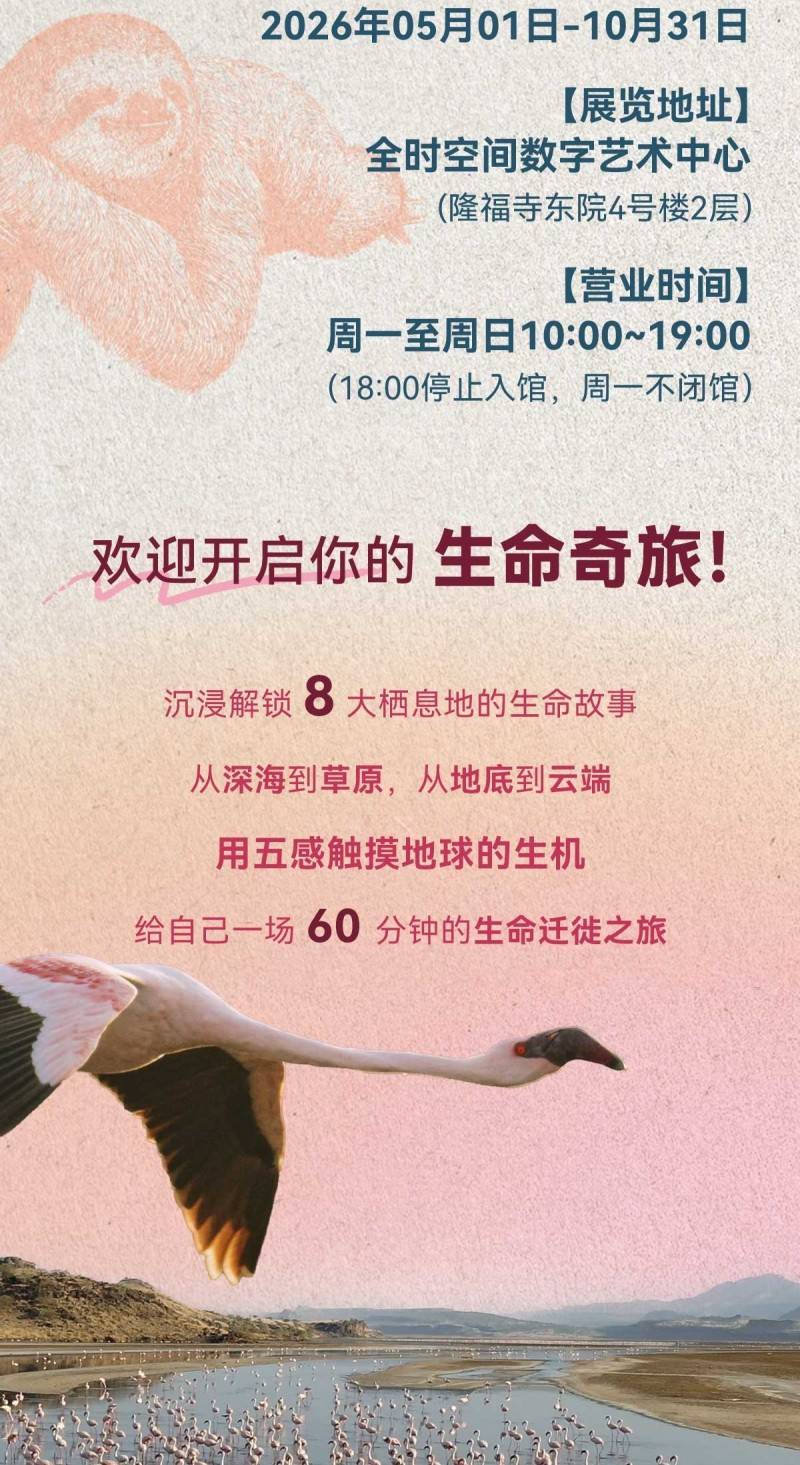 1、展览时间:2026年5月1日-2026年10月31日,周一至周日10:00-19:00(18:00停止入场,特殊活动开闭馆时间,以场馆实际运营时间为准);