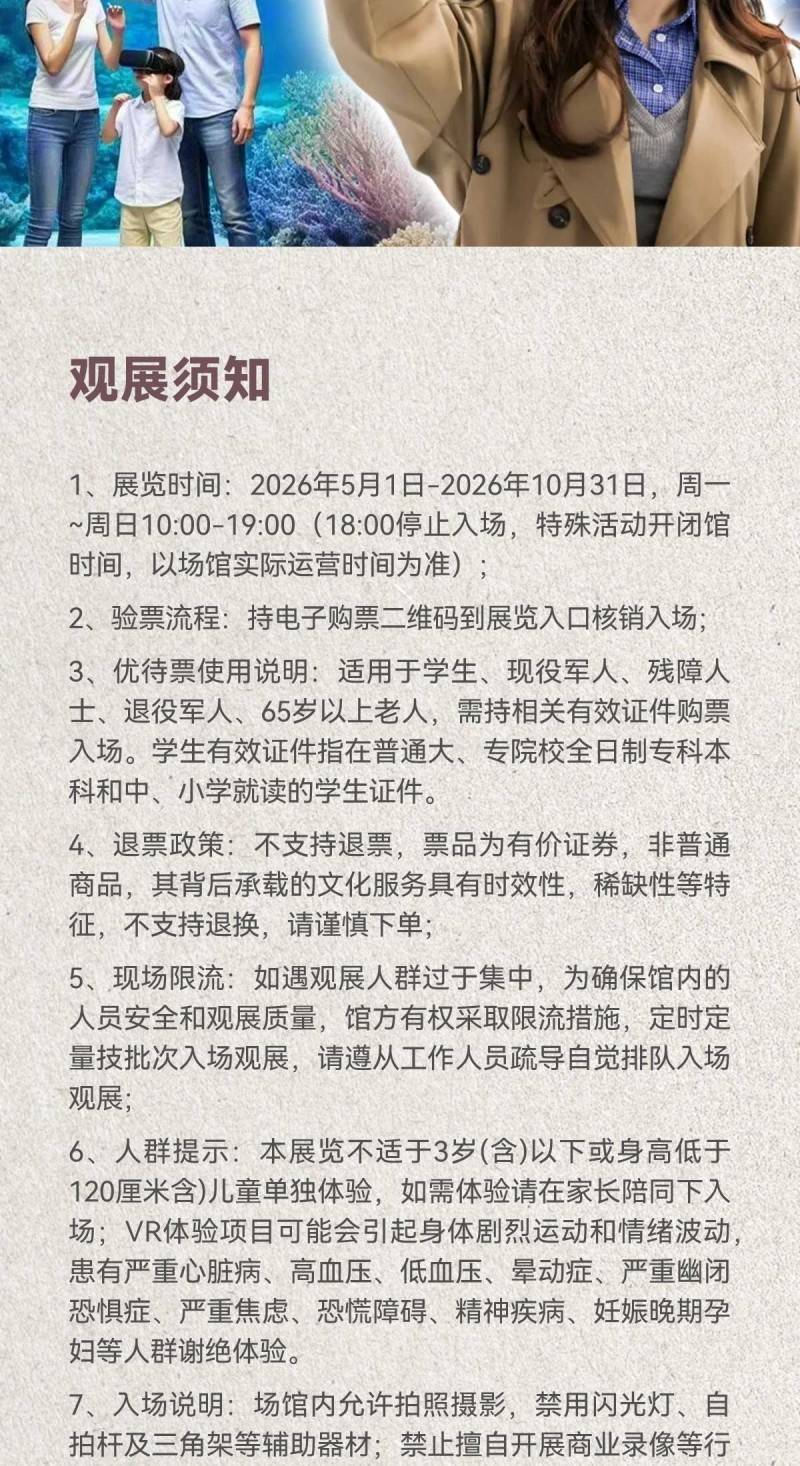 6、人群提示:本展览不适于3岁(含)以下或身高低于120厘米含)儿童单独体验,如需体验请在家长陪同下入场;VR体验项目可能会引起身体剧烈运动和情绪波动,患有严重心脏病、高血压、低血压、晕动症、严重幽闭恐惧症、严重焦虑、恐慌障碍、精神疾病、妊娠晚期孕妇等人群谢绝体验;