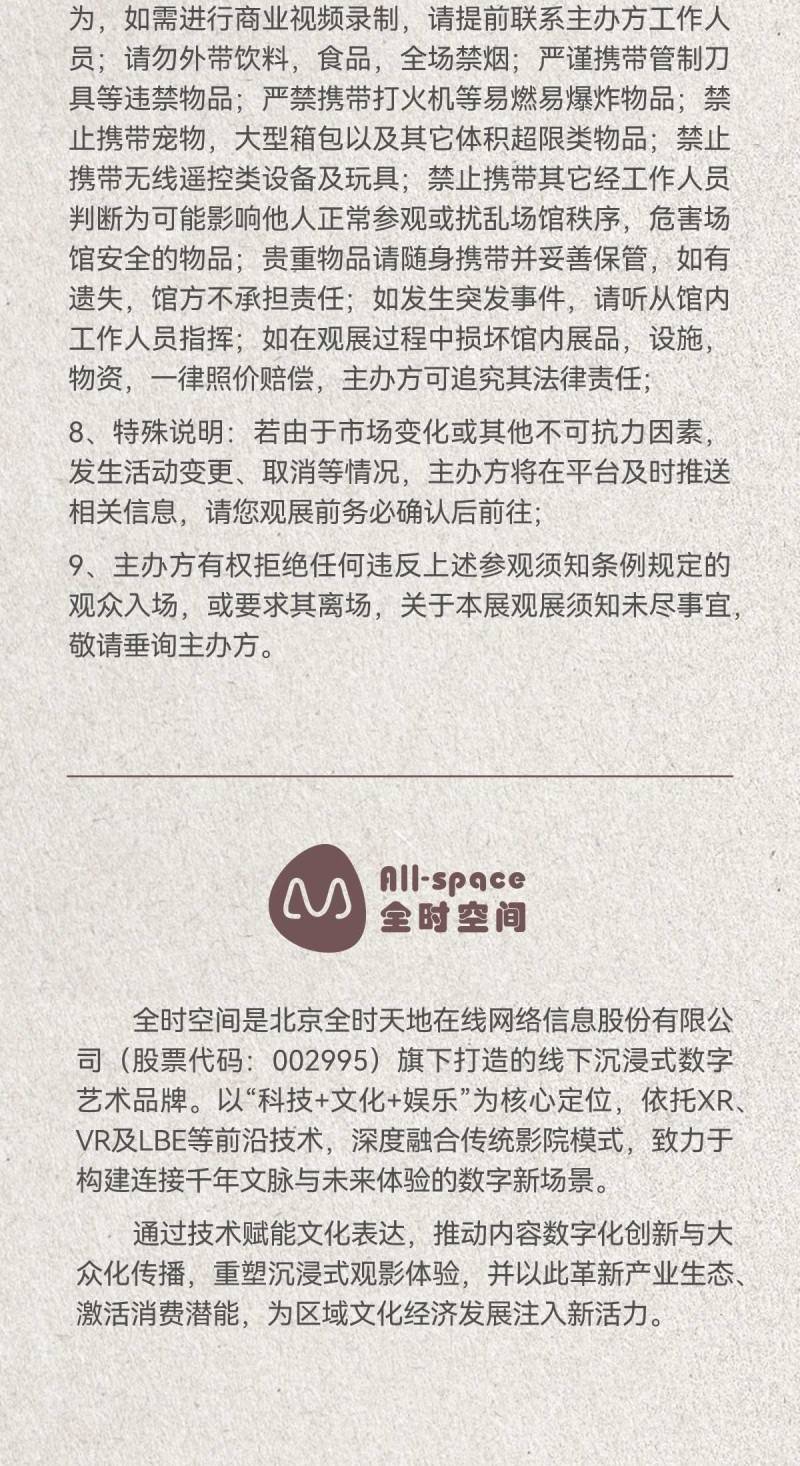 7、入场说明:场馆内允许拍照摄影,禁用闪光灯、自拍杆及三角架等辅助器材;禁止擅自开展商业录像等行为,如需进行商业视频录制,请提前联系主办方工作人员;请勿外带饮料,食品,全场禁烟;严谨携带管制刀具等违禁物品;严禁携带打火机等易燃易爆炸物品;禁止携带宠物,大型箱包以及其它体积超限类物品;禁止携带无线遥控类设备及玩具;禁止携带其它经工作人员判断为可能影响他人正常参观或扰乱场馆秩序,危害场馆安全的物品;贵重物品请随身携带并妥善保管,如有遗失,馆方不承担责任;如发生突发事件,请听从馆内工作人员指挥;如在观展过程中损坏馆内展品,设施,物资,一律照价赔偿,主办方可追究其法律责任;