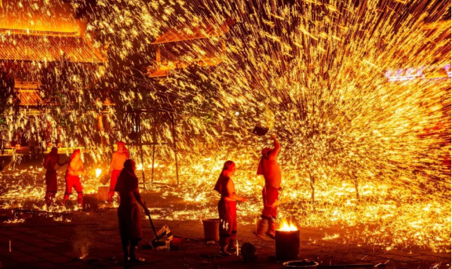 就能看到震撼的打铁花,漫天的火花、炫目的场景,