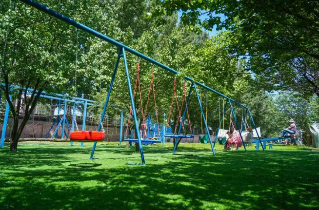 、沙池、摸鱼池、充气滚筒、秋千、吊桥等游乐设施,