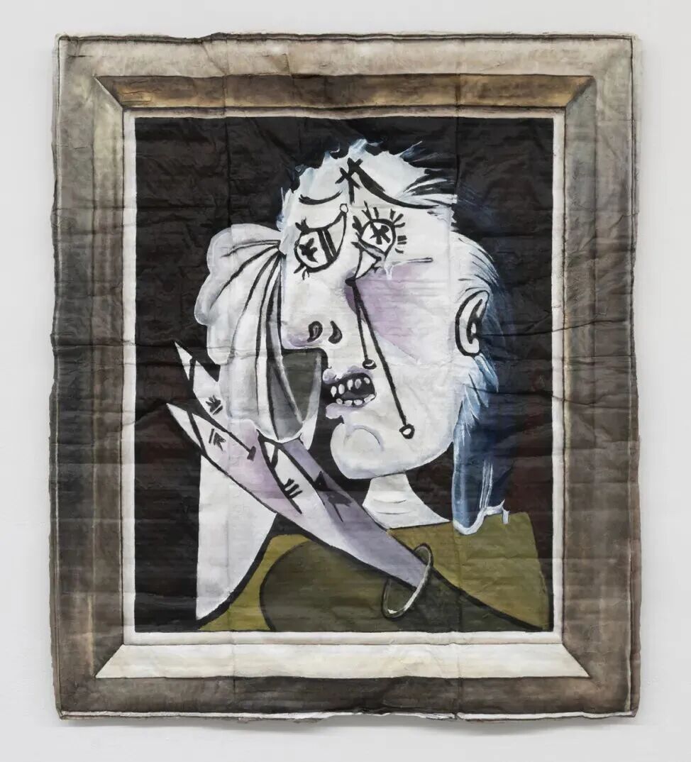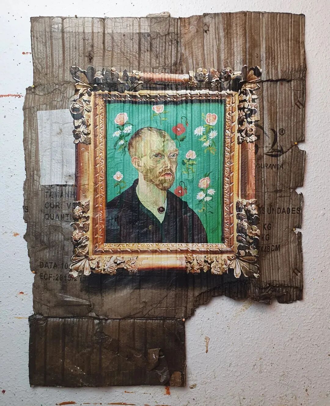 擅长运用“错视画”的概念,让作品看似是对经典的“临摹”,实则是对艺术史的致敬:比如将梵高的《有柏树的麦田》画在废纸板上,斑驳的纸板纹理与金色的麦田交织,既保留了原作的诗意,又增添了“时光流逝”的叙事感。又如他以脆弱的废纸板为载体重构毕加索的《哭泣的女人》,毕加索原作以锐利线条与跃动色块将绝望与痛苦具象化,胡里奥则通过其特有的破碎平面与碎片化处理表达哭泣的强烈情绪。正如他本人所说:“我将艺术作品视为指向观者、旨在使其困惑的器物——这种困惑,会让人们重新思考如何感知图像,乃至感知现实。”